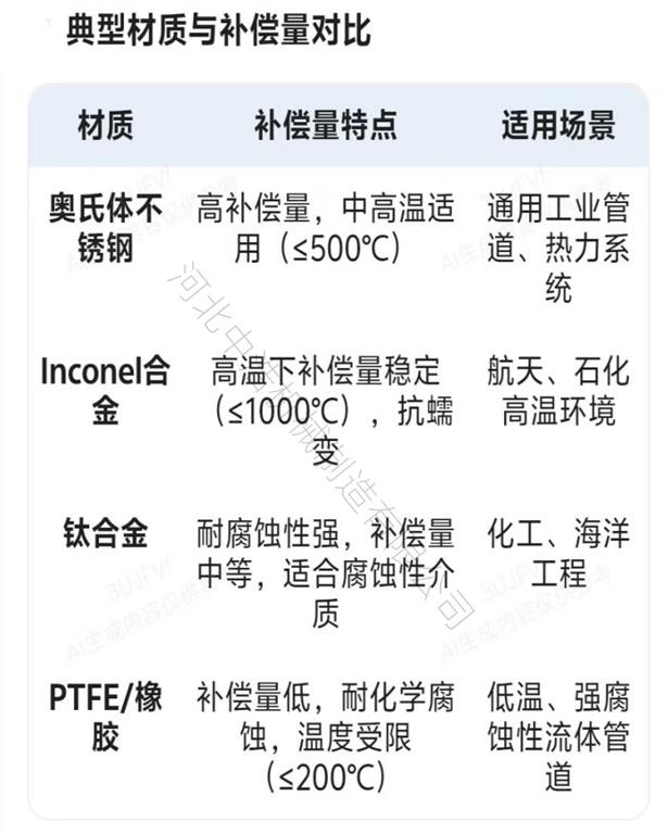 疲勞壽命與循環(huán)補(bǔ)償能力,例如316不銹鋼或鎳基合金 屬于高疲勞強(qiáng)度材質(zhì),可承受多次循環(huán)變形,長期保持設(shè)計補(bǔ)償量。而普通碳鋼屬于低疲勞強(qiáng)度材質(zhì),易遭受反復(fù)變形后開裂,而補(bǔ)償量逐漸下降。從腐蝕性方面考慮,哈氏合金、鈦合金,屬于耐腐材質(zhì),在腐蝕性環(huán)境中,不易劣化,補(bǔ)償量穩(wěn)定,而普通304材質(zhì)在弱酸環(huán)境中易腐蝕減薄,從而導(dǎo)致補(bǔ)償量異常增大造成泄露。從材料厚度方面考慮,薄壁材料補(bǔ)償量較大,但承壓能力較低,一般是用低壓系統(tǒng),而厚壁材料,補(bǔ)償量較小,但可耐高壓。因而在選擇時需要綜合補(bǔ)償量與強(qiáng)度關(guān)系。在選擇時還可參照典型材料與補(bǔ)償量對照表: