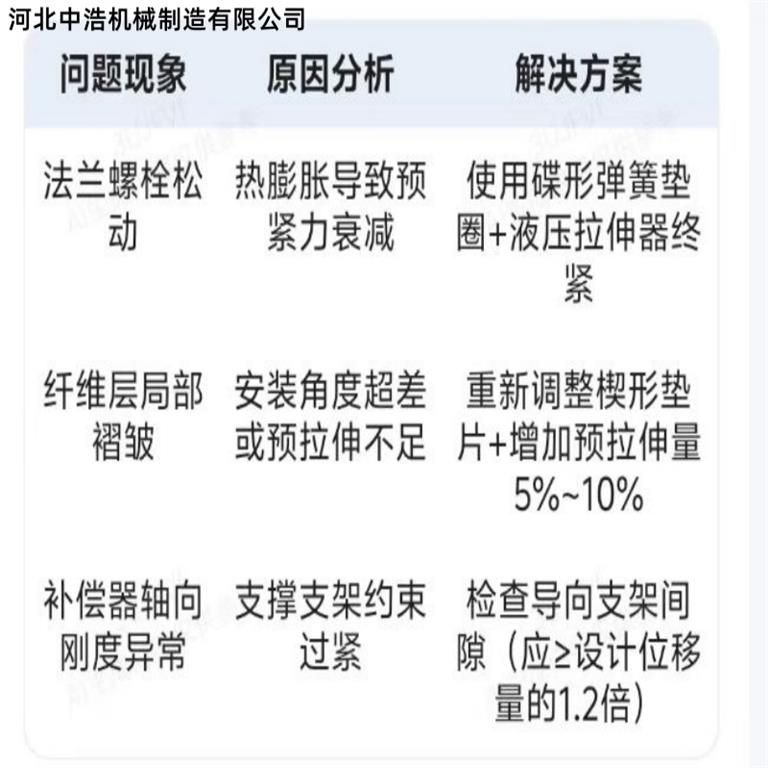 纖維織物補(bǔ)償器在安裝時(shí)避免不了安裝誤差,為了解決安裝誤差問題中浩機(jī)械總結(jié)主要可從安裝前零誤差測量和定位到預(yù)變形量調(diào)整,其次對(duì)支撐結(jié)構(gòu)進(jìn)行優(yōu)化,分階段緊固與應(yīng)力調(diào)整,安裝后進(jìn)行試驗(yàn)測試,從而總結(jié)常見問題及解決方法。