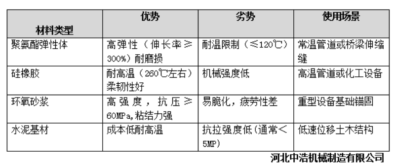 力學(xué)性能主要體現(xiàn)在彈性模量和抗拉抗壓強(qiáng)度以及斷裂韌性,低彈性材料柔韌性好可適應(yīng)較大位移變形,減少應(yīng)力集中,高彈性材料(如混凝土)易因剛性過渡而開裂??估箟簭?qiáng)度高強(qiáng)度材料如(環(huán)氧樹脂)可承受更大載荷和頻繁位移,使用壽命長。而低強(qiáng)度材料易在動態(tài)載荷下疲勞損壞。針對斷裂韌性問題,可用高韌型材料,可抑制微小裂紋引起的斷裂。從耐久性考慮高溫環(huán)境載300℃以上可選用硅酮膠等耐溫材料,普通材料極易發(fā)生脆化。考慮耐化學(xué)腐蝕化工廠環(huán)境需要抗酸堿材料,例如氟橡膠,避免腐蝕失去密封性。而耐腐性需要選擇對紫外線敏感材料如(聚氨酯)添加抗老劑,避免使用開裂現(xiàn)象??紤]界面強(qiáng)度和搜索率,如低粘性材料(如普通水泥砂漿)極易與金屬基體脫粘,導(dǎo)致滲漏。而高收縮材料(如固化環(huán)氧樹脂)可能因收縮應(yīng)力引發(fā)斷裂,需要添加膨脹劑。從膨脹系數(shù)考慮,不同材質(zhì)不同。從施工適應(yīng)性考慮流動性和固化時間,狹窄縫隙需高流動材料,可用自流平聚合物,確使填充緊密。從固化時間考慮,如果搶修時間短可用雙組分聚氨酯,凝聚時間較短。但需要控制施工進(jìn)度。一般情形可參照材料對比表:
